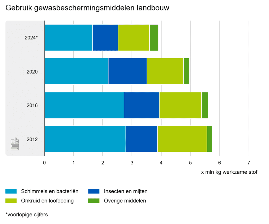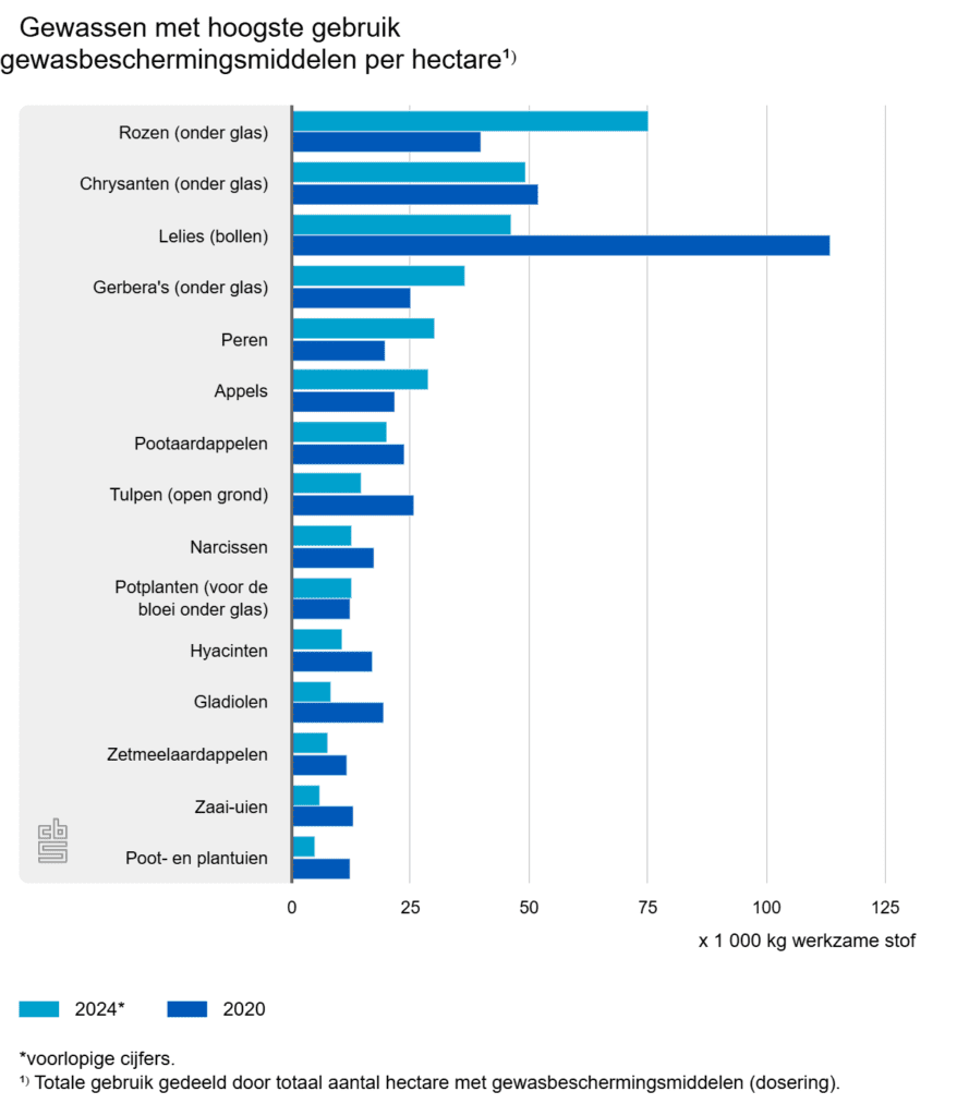 In 2024 gebruikte de landbouw 3,9 miljoen kilogram gewasbeschermingsmiddelen, 22 procent minder dan in 2020. Per hectare gebruikt de landbouw 5,6 kilogram, vier jaar eerder was dat 7,1 kilogram. Om schimmels, onkruid of insecten te bestrijden gebruikt men minder middelen. In de lelieteelt halveerde het bestrijdingsmiddelengebruik ruimschoots. Dit blijkt uit nieuwe cijfers van het Centraal Bureau voor de Statistiek (CBS) over gewasbeschermingsmiddelengebruik bij 44 landbouwgewassen.