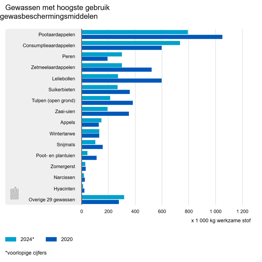 In 2024 gebruikte de landbouw, net als in 2020, meer dan de helft van de gewasbeschermingsmiddelen in de teelt van aardappelen en lelies. Voor de lelieteelt gebruiken bollentelers 273 duizend kilogram middelen, in 2020 was dat 601 duizend kilogram. Lelietelers gebruiken 220 duizend kilogram minder paraffineolie. Het schimmelbestrijdingsmiddel mancozeb is inmiddels verboden; in 2020 gebruikte de lelieteelt daar nog 114 duizend kilogram van. Daardoor is het middelengebruik voor schimmelbestrijding voor lelies 72 procent lager dan in 2020.