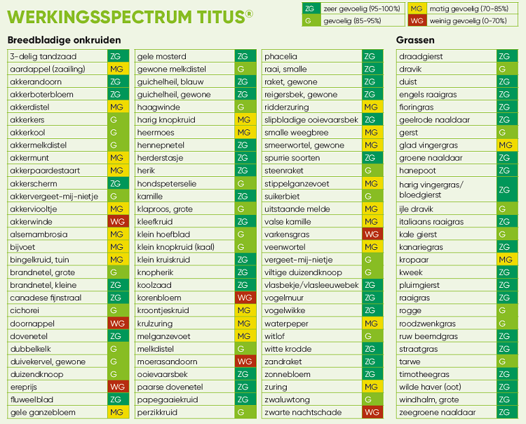Titus® heeft een breed werkingsspectrum bij de na-opkomst bestrijding van onkruiden, waaronder een aantal lastig te bestrijden grassen en andere breedbladige onkruiden zoals kweek, hanepoot, kamille en 3-delig tandzaad.