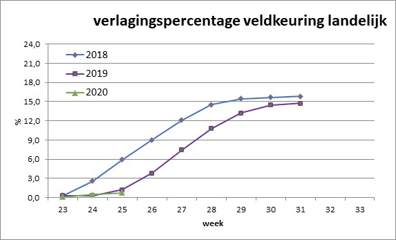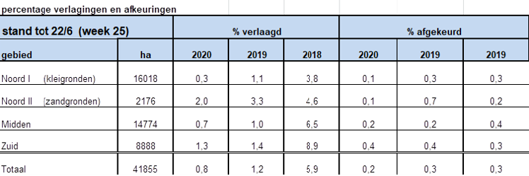Bijna 95% van de pootgoedpercelen is voor de eerste keer gekeurd. Tot nu toe is er 312 hectare verlaagd. Dit komt uit op 0,8 procent van de gehele veldkeuring.