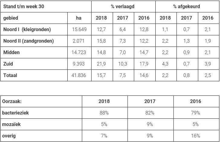 De tweede keuring is voor een belangrijk deel afgerond. Van ongeveer 8.000 hectare is het loof vernietigd en er is ondertussen 13 hectare als gerooid gemeld. De bemonsteringen voor de nacontrole zullen naar alle waarschijnlijkheid in week 33 beginnen. Wanneer het droog blijft zal het rooien naar verwachting nog niet op gang komen.