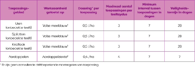 Houdt er rekening mee dat het verlengde spuitinterval van Zorvec Endavia® zoals bij aardappelen, in ui-achtigen niet van toepassing is. Zet Zorvec Endavia® alleen preventief in het schema in.