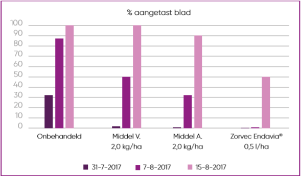 0,5 l/ha Zorvec Endavia® laat in de proef de sterkste werking tegen valse meeldauw zien. (Omdat de bespuitingen stopten kwamen uiteindelijk ook in de Zorvec® veldjes aantasting).