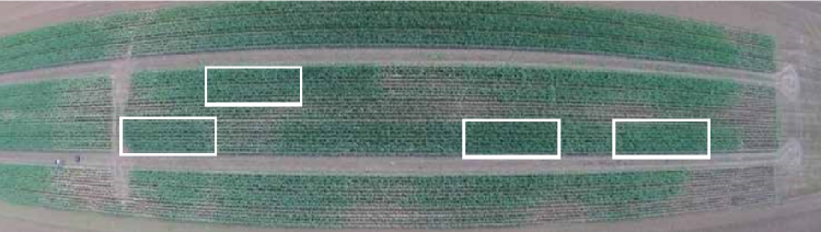 Dronefoto van het proefveld in uien in Westmaas. De witte balken geven de Zorvec veldjes aan die het gezondst bleven.