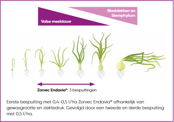 Zorvec Endavia® is een combinatie van Zorvec® en Benthiavalicarb. Naast de sterke werking van Zorvec® op valse meeldauw, geeft ook de Benthiavalicarb een goede aanvullende werking. Benthiavalicarb kennen we van het middel Valbon. Deze twee werkzame stoffen versterken elkaar. Samen met de sterke OD-formulering geeft dit een robuuste bestrijding van valse meeldauw. Zorvec Endavia® mag in een dosering van 0,5 l/ha maximaal 3 keer per seizoen in uien worden toegepast. Het minimale interval is 7 dagen met een veiligheidstermijn van 28 dagen.
