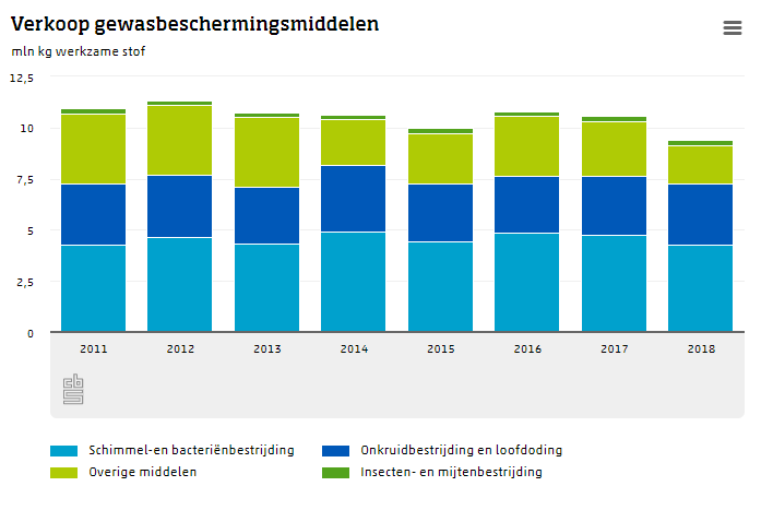 Sinds het begin van de meting in 2011 schommelt de verkoop van gewasbeschermingsmiddelen tussen de 9,4 en 11,4 miljoen kilogram werkzame stof. Het grootste deel (46 procent) van de verkochte gewasbeschermingsmiddelen werd in 2018 ingezet bij de bestrijding van schimmels en bacteriën.