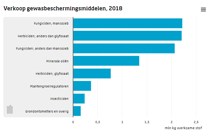 Vanwege de mogelijke risico’s voor het milieu en de gezondheid krijgen sommige werkzame stoffen in gewasbeschermingsmiddelen zoals mancozeb en glyfosaat de laatste tijd meer aandacht. De verkoop van het fungicide mancozeb is in 2018 vergeleken met het jaar daarvoor met bijna 10 procent gedaald naar 2,2 miljoen kilogram werkzame stof. Bij de andere fungiciden is de afname met bijna 9 procent naar 2,1 miljoen kilogram iets minder sterk.