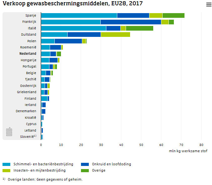 Het aandeel in de verkoop van gewasbeschermingsmiddelen in Nederland was dat jaar 2,8 procent van de totale Europese afzet. Het Nederlandse landbouwareaal besloeg in 2017 ongeveer 1 procent van het totale Europese landbouwareaal.