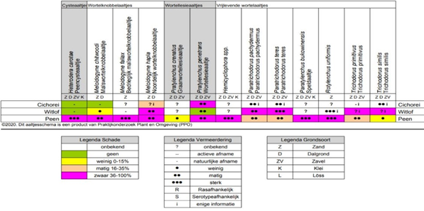 Schema WUR: Aaltjesvermeerdering en schade op cichorei, witlof en wortelen door verschillende aaltjes