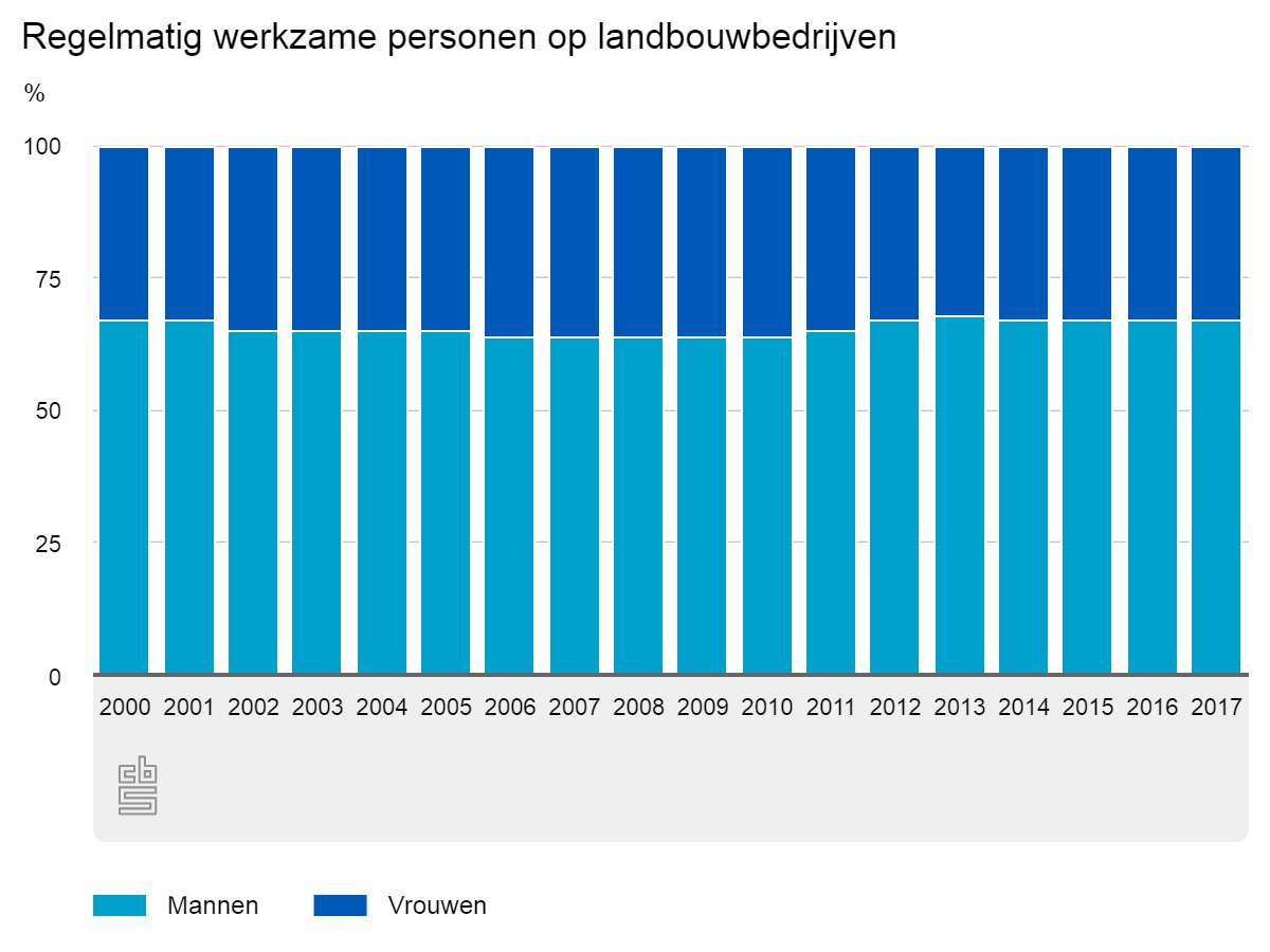 Het aandeel vrouwen dat werkzaam is in de landbouwsector schommelt sinds het jaar 2000 rond een derde van het aantal werkzame personen. In 2017 ging het om ruim 56 duizend vrouwen. De meesten waren werkzaam op familiebedrijven. Dat blijkt uit de definitieve cijfers van de Landbouwtelling van het CBS.