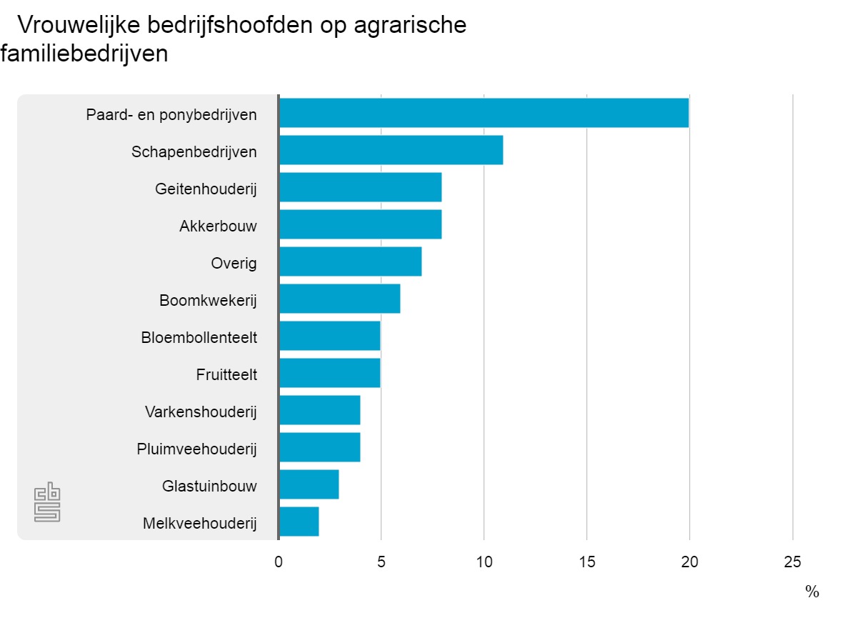 In 2017 waren zo’n 2800 vrouwen actief als bedrijfshoofd. Het aandeel vrouwelijke bedrijfshoofden is in de periode 2005-2017 afgenomen van 9 naar 6 procent. De meeste vrouwelijke bedrijfshoofden zijn in de landbouwsector te vinden op paard- en ponybedrijven. Op 20 procent van deze bedrijven staat een vrouw aan het roer. Het aandeel vrouwelijke bedrijfshoofden is het laagst op melkveehouderijbedrijven (2 procent). De gemiddelde leeftijd van vrouwelijke bedrijfshoofden is 55 jaar, deze leeftijd is gelijk aan die van de mannelijke bedrijfshoofden. Van de vrouwelijke bedrijfshoofden werkte vorig jaar 71 procent gemiddeld 20 uur per week of meer.