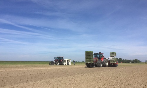 Blok heeft aardappelen, uien, cichorei, suikerbieten, tarwe en knolselderij in zijn bouwplan. De knolselderij is deze week als laatste gewas de grond in gegaan. In samenspraak met zijn afnemer kiest de teler dit jaar voor vroege rassen. Blok is over het algemeen tevreden over de groeivorderingen op zijn percelen: “De opkomsten zijn prima over het algemeen. Alleen de bieten en uien blijven wat achter. Om regen moet je niet vragen zeggen ze, maar je moet het niet verzoeken dus ik zeg maar niet te veel. Voor dit moment in het seizoen is het prima. Ik had graag een wat egalere opkomst gezien in de uien, maar dat trekt als het goed is gedurende het groeiseizoen nog wel weer bij, verwacht ik. Ook al lopen sommige gewassen qua groei iets achter, hebben we tot nu toe niks te klagen.”