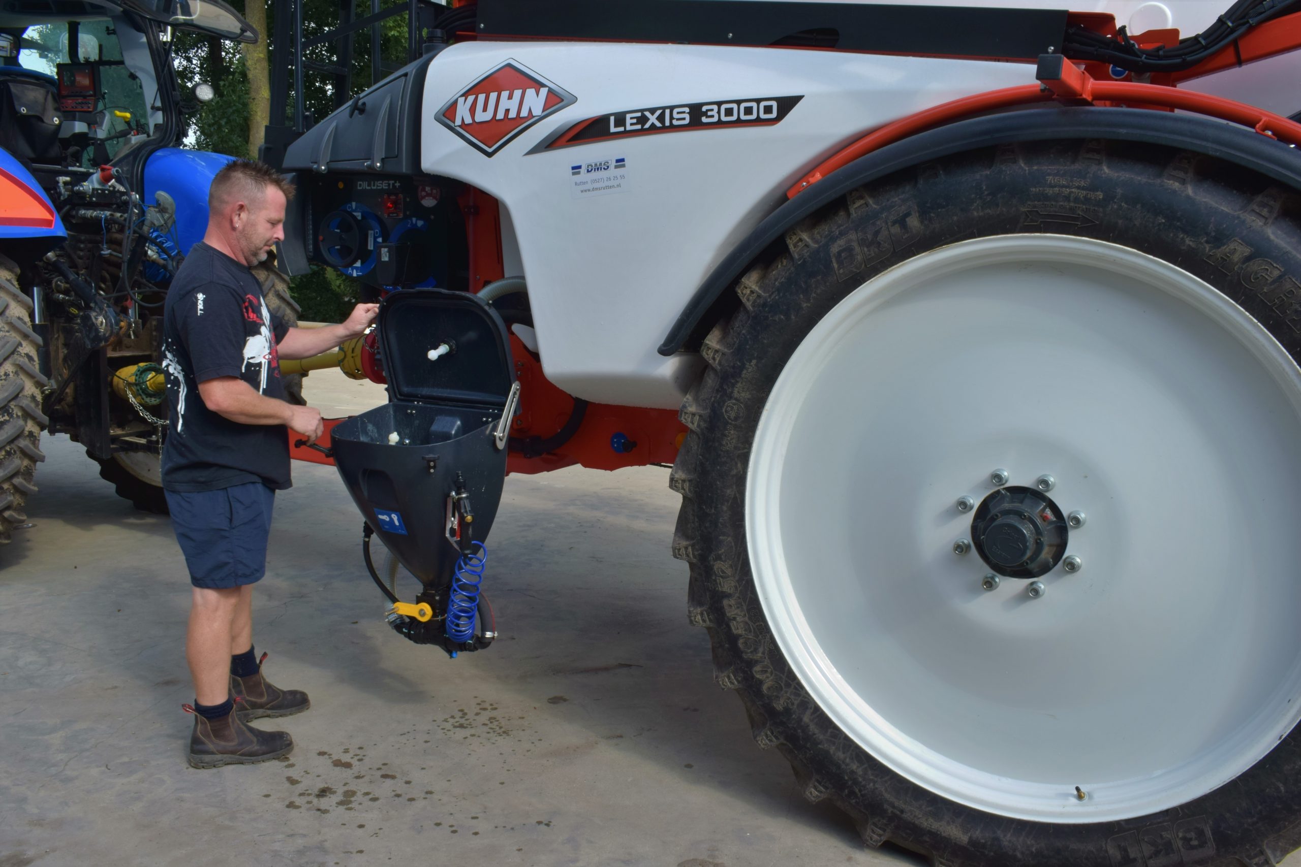 Eén van de opties op de Kuhn Lexis 3000 is de vul/spoelinrichting. Keppel: "Nu hoef ik niet meer op de spuit te klimmen"