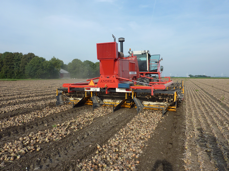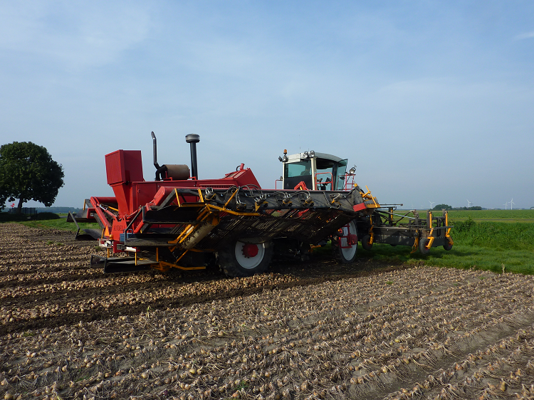 Het landbouwbedrijf zocht dus naar een machine met een goed vermogen en een goede olie-opbrengst. Samen met Andela Techniek&Innovatie uit Nagele werd het plan ontwikkeld om een Agrifac bietenrooier te ontmantelen en om te bouwen. In de werkplaats van Van Beem in Zeewolde is de machine verder ontwikkeld. “Er zitten rooielementen van Keulmac in.” De bietenrooier is voor- en achtergestuurd. De stuuruitslag is dusdanig verruimd dat de complete machine, met een transportbreedte van 3,25 meter, een draaicirkel van 9 meter heeft. Het motorvermogen is 360 pk. ,,De omstandigheden bij het uienrooien zijn over het algemeen zwaar. Op bepaalde momenten ligt de motor wel krom, maar uiteindelijk draait die zonder veel problemen.”