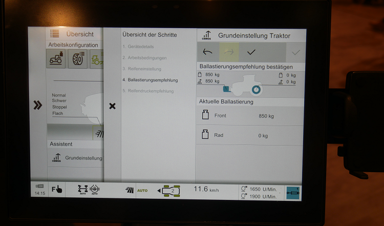 Op basis van deze achtergrondinformatie beveelt het systeem in eerste instantie extra ballast aan die nodig kan zijn in de vorm van voor-, achter- en wielgewichten. De bestuurder voert vervolgens de werkelijke waarden in die door het systeem worden verwerkt. Elke afwijking van de aanbevelingen wordt direct vertaald naar optimalisatie-aanbevelingen bijvoorbeeld voor de bandenspanning, verhogen van de druk op de achteras, hydraulische dieptestelling, werkkwaliteit en gewichtsverdeling.