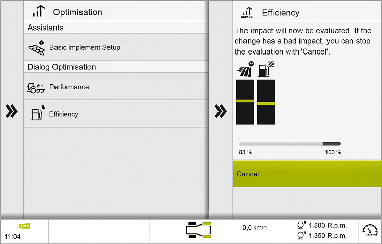 De chauffeur kan het optimalisatiedialoogvenster op elk gewenst moment weer oproepen. CEMOS voor tractoren helpt vervolgens actief door verdere suggesties te doen om de prestaties van de combinatie tractor en werktuig te verbeteren.