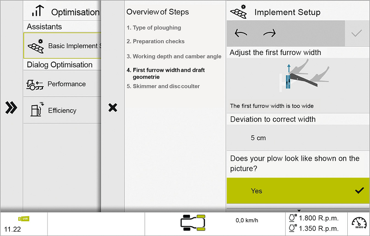 Een andere functie van CEMOS voor tractoren is het ondersteunen van de basisinstellingen van het werktuig. Alleen al deze stap kan een positief effect hebben op brandstofverbruik, slijtage, doorvoer en werkkwaliteit. Ook hier begeleidt CEMOS voor tractoren de bestuurder stap voor stap door duidelijke aanbevelingen te doen. Bij het ploegen kan dit bijvoorbeeld inhouden dat de werkdiepte, voorschaar, het trekpunt en de treklijn worden aangepast. Uitleg en diagrammen van het werktuig helpen de juiste instellingen voor een bepaalde situatie te bepalen.