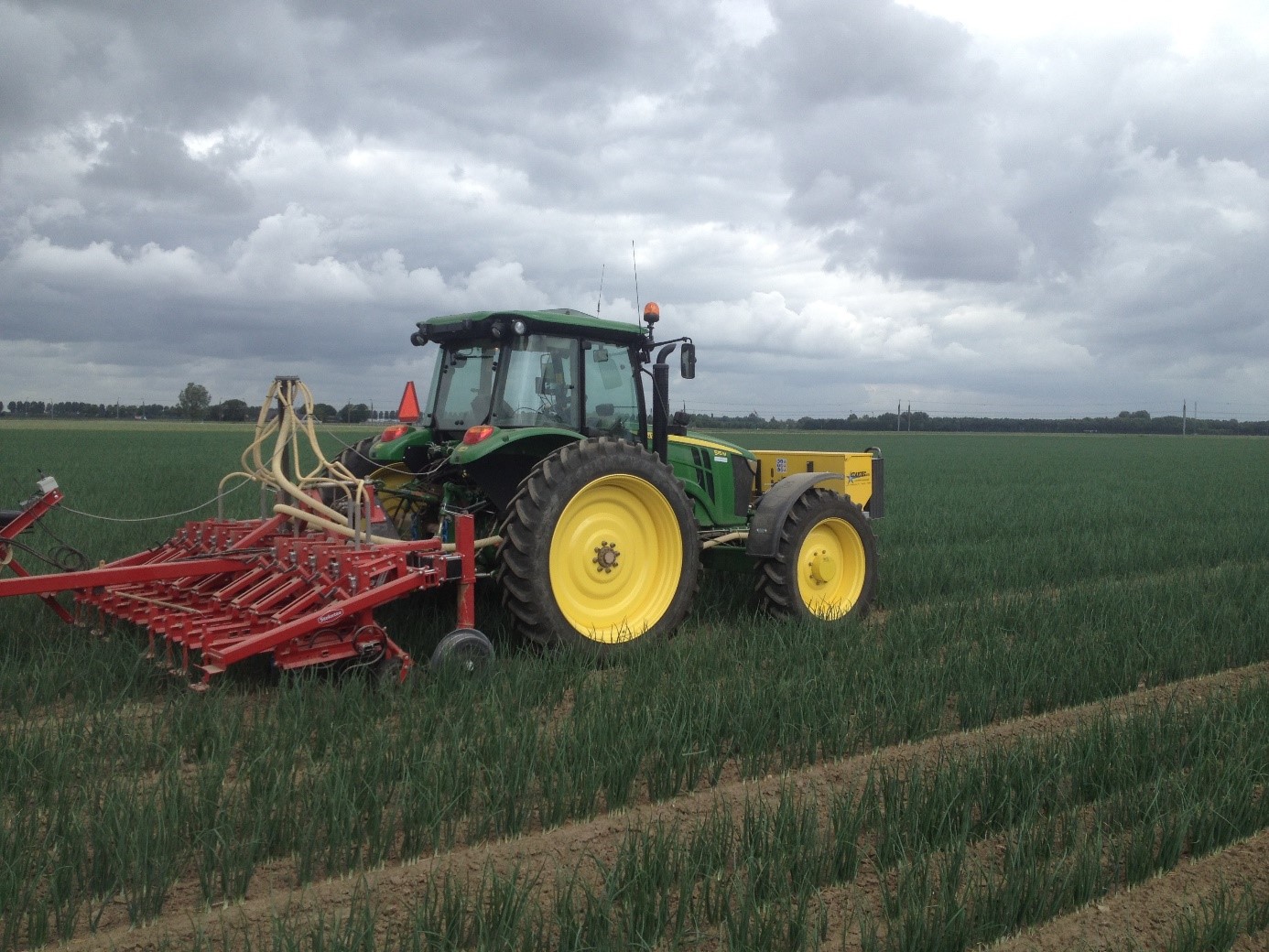 Foto 1 & 2: Op de foto's wordt de bemesting- en schoffelcombinatie getoond die, gelijk met het schoffelen, de DCM Eco-mix 3 (NPK 12-0-3) in de rij doseert op een uienperceel.