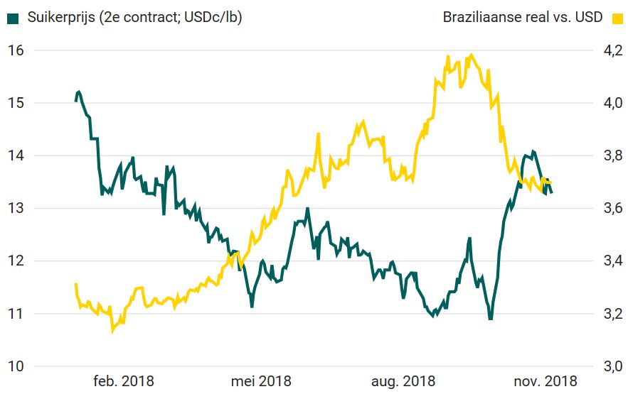 Met de recente scherpe prijsstijging is de beweeglijkheid van de suikerprijs in de afgelopen maand opgelopen tot gemiddeld 20%. Dit is ruim boven het gemiddelde over heel 2018 en eveneens boven het gemiddelde op de langere termijn, gemeten sinds 2000. Een combinatie van factoren heeft de prijs en de volatiliteit naar een hoger niveau getild. Niet alleen het sterke herstel van de Braziliaanse real – die sterk correleert met de suikerpijs – heeft hier invloed op gehad, maar ook de ontwikkelingen in de aanbodzijde droegen bij.
