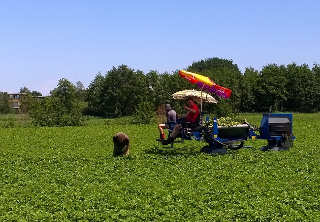 Op het aardappelland aan de Volgezangweg in Rottum op de grens van Heerenveen worden de aardappelplanten geselecteerd. Vanuit een rijdend wagentje hebben de deskundigen een beteren kijk op de zieke planten. Deze worden verwijderd en in een bak op het wagentje gedeponeerd. Voor dit werk is een opleiding vereist. Sommige hebben tegen de felle zon een parasol op de wagen.