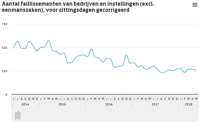 Dalingen en stijgingen van het aantal faillissementen kunnen elkaar snel opvolgen. In mei 2013 piekte het aantal uitgesproken faillissementen, voor zittingsdagen gecorrigeerd. Daarna is er sprake van een dalende trend. In augustus 2017 bereikte het aantal faillissementen het laagste niveau sinds 2001. De trend is daarna nagenoeg vlak.