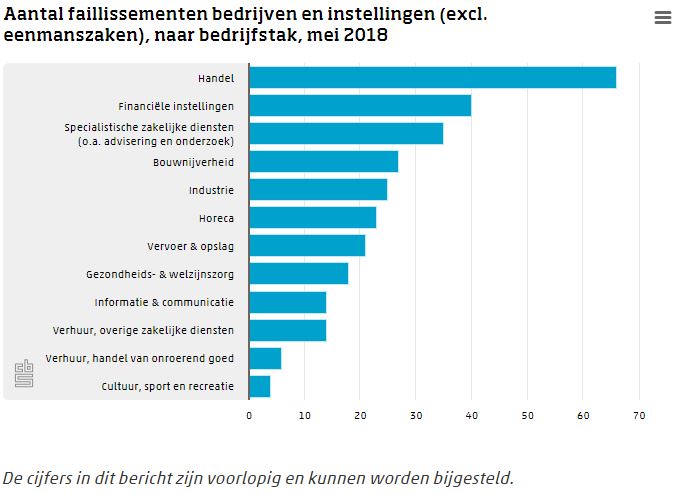 Het aantal failliet verklaarde bedrijven is gedaald. In mei 2018 zijn er 10 bedrijven minder failliet verklaard dan in april, meldt het CBS. De meeste faillissementen in mei zijn uitgesproken in de handel.