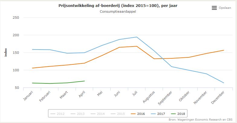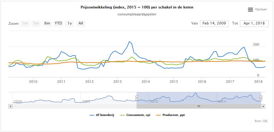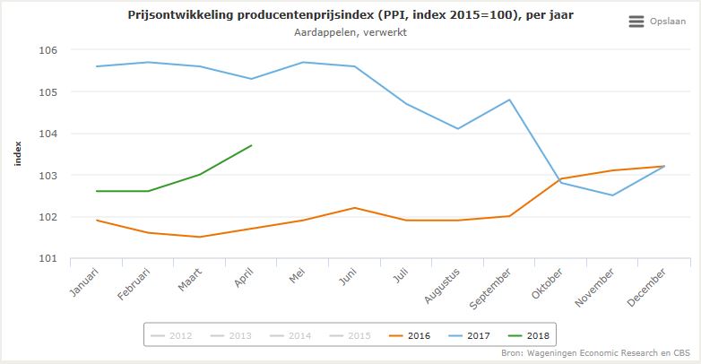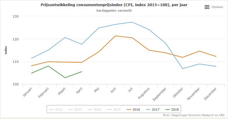 De producentenprijsindex (PPI) is amper gestegen van 103 punten in januari naar 104 punten in april 2018 – een iets lager niveau dan in april 2017 (2015=100). De Nederlandse aardappelverwerkende industrie verwerkte afgelopen jaar voor het eerst meer dan 4 miljoen ton aardappelen in een seizoen. Verwerkers kopen via contracten in, waardoor ze relatief stabiele verkoopprijzen kunnen hanteren. De consumentenprijsindex daalde vanaf september 2017 met 11% van 118 tot 105 punten in januari 2018 (2015=100). Sinds januari fluctueert de prijs en deze is in april uitgekomen op 105 punten. Daarmee ligt het prijsniveau voor de consument 10% lager dan vorig jaar.