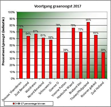 Het werkgebied van het CZAV strekt zich uit van Zeeuws-Vlaanderen via de Zeeuwse eilanden naar de Hoeksche Waard tot aan het rivierengebied en Zuid-Holland. Procentueel blijft de regio Voorne-Putten op dit moment sterk achter op de rest (39 procent) en boekt Tholen/Sint-Philipsland de meeste vorderingen bij de dorswerkzaamheden (85 procent geoogst). Gemiddeld komt dat dus uit op een gedorst percentage tussen de 69 en 72 procent. “Vooralsnog zijn we zeer tevreden over de voortgang en de kwaliteit. Alleen als we nu drie weken lang alleen maar regen krijgen gaan de gehaltes nog omlaag, maar dat verwachten we zeker niet.”