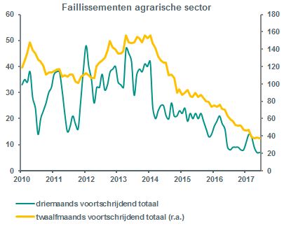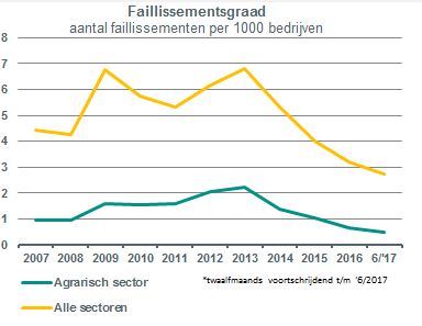 - In de eerste helft van 2017 gingen er twintig agrarische bedrijven failliet. Het aantal faillissementen in de agrarische sector is al sinds 2013 aan het dalen en bevindt zich nu op een historisch laag niveau.