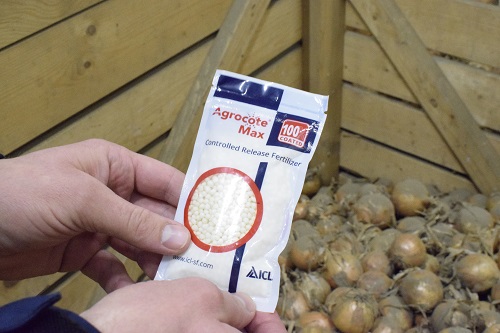 Hierdoor ben ik niet afhankelijk van weersomstandigheden voor het laten slagen van een bij-bemesting. Vooral in de uienteelt is het belangrijk dat het praktisch werkbaar is. Een goede harde, uniforme korrel die gemakkelijk te strooien is. Ik probeer met een zo laag mogelijke footprint te ondernemen, dan moet je niet op iedere twaalf meter korrels hoeven strooien. Ik heb Agrocote Max op 45 meter gestrooid vanaf de vaste rijpaden.”