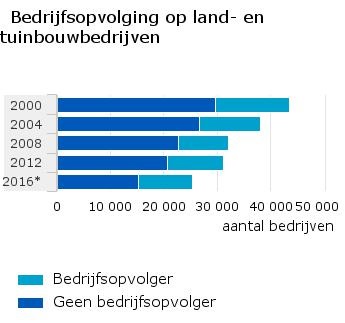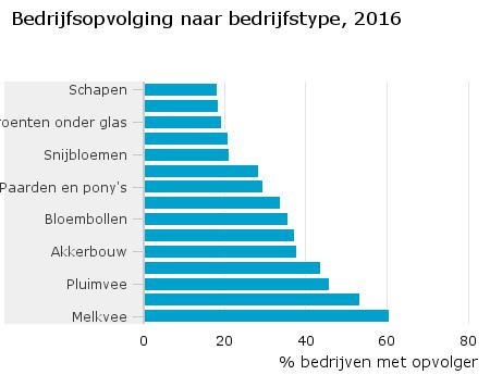 Op de meeste boerderijen met een bedrijfshoofd van 55 jaar of ouder staat geen bedrijfsopvolger klaar. Dit betekent dat de komende tien jaar ruim 15 duizend boerderijen zullen verdwijnen, of de bedrijfsopvolging wordt op een andere manier opgelost. Hoe groter het bedrijf, hoe groter de kans is dat er een bedrijfsopvolger is. Maar ook de animo voor bedrijfsovername op grote bedrijven slinkt. Dit meldt CBS op basis van voorlopige cijfers van de Landbouwtelling.