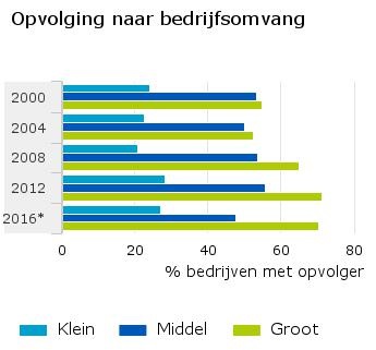 Bedrijfsgrootte speelt een belangrijke rol bij de bedrijfsopvolging. Vooral op grote en middelgrote bedrijven is een opvolger beschikbaar. Van de grote bedrijven heeft 70 procent in 2016 een opvolger, van de middelgrote bedrijven is dit bijna 50 procent. Het percentage bedrijfsopvolgers voor grote en middelgrote bedrijven zat sinds 2004 in de lift, maar is van 2012 tot 2016 iets afgenomen. Het aandeel bedrijfsopvolgers nam in deze periode voor grote bedrijven iets af van 71 procent naar 70 procent, en voor middelgrote bedrijven van 56 procent naar 48 procent. Van de kleine bedrijven is het percentage bedrijfsopvolgers gedaald van 28 procent naar 27 procent.