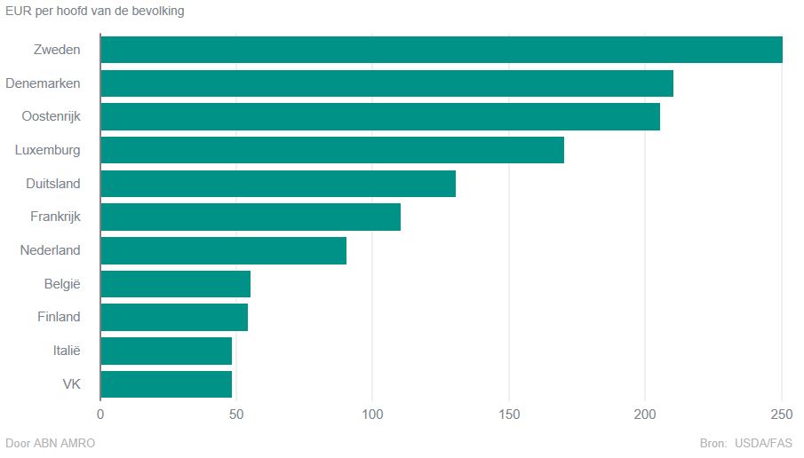 Duitsers geven circa EUR 130 per hoofd van de bevolking uit aan biologische producten. Nederlanders geven in vergelijking tot de Duitsers een stuk minder uit aan biologische voeding. Nederland staat in Europa op de zevende plaats.
