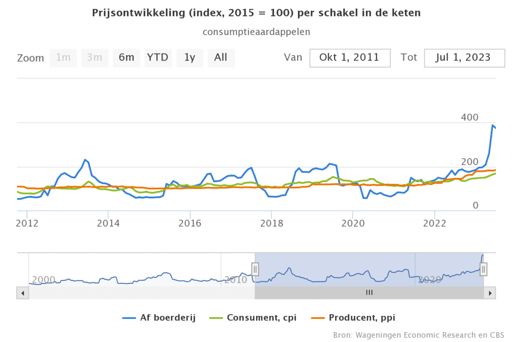 De consumentenprijsindex van aardappelen is in juli 2023 uitgekomen op 168 punten (2015=100). Dat is 8 procent hoger dan de consumentenprijs in mei 2023 en 17 procent hoger dan in juli 2022. De aardappelprijs af boerderij is in de periode juni en juli significant gestegen. De index kwam in juli 2023 uit op 374 punten, 44 procent hoger dan in mei 2023 en 132 procent hoger dan in juli 2022. De prijsindex van de verwerkende industrie kwam in juli 2023 uit op 184 punten, 1 procent hoger dan in mei en 27 procent hoger dan in juli 2022.