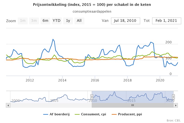 In januari 2021 is de consumentenprijsindex uitgekomen op 111 punten. Dit is 3 punten (2%) lager is dan in november 2020 en 13% lager is dan in januari 2020. Vanaf het begin van het seizoen 2019/2020 vertoonde de consumentenprijs een neerwaartse lijn tot maart 2020. De Covid-19-crisis heeft de vraag naar verse aardappelen en aardappelproducten in de winkel doen toenemen. Wat tot deze hogere prijzen leidde. Vanaf het nieuwe oogstseizoen (2020/2021) zijn de consumentenprijzen echter weer gedaald.