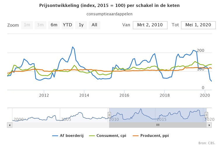 Vanaf maart tot mei daalde de prijs echter met 59% als gevolg van de coronacrisis. Horeca en fastfoodrestaurants werden wereldwijd gesloten om corona besmettingen te voorkomen. De mondiale vraag naar frites daalde sterk en de Nederlandse fritesexport zakte in. De aardappelverwerkende industrie verwerkte fors minder fritesaardappelen. In de bewaarplaatsen ligt een voorraad van ruim 1 miljoen ton aardappelen. De onverkoopbare voorraden zal de telersprijzen de rest van dit seizoen zeer sterk doen dalen. De weergegeven telersprijzen zijn gebaseerd op markt- en contractprijzen, exclusief eventuele tegemoetkomingen op basis van de ‘Compensatieregeling fritesaardappelen’. Voor het komende seizoen wordt een licht uitbreiding van het consumptieaardappelareaal in Noordwest Europa voorspelt; zolang groeiomstandigheden goed blijven, de vrieshuizen overvol frites zitten en de horeca inclusief fastfood niet volledig herstellen, zullen prijzen voorlopig onder druk staan.