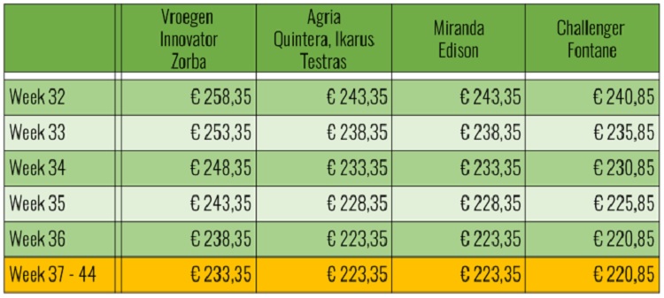 Voor vroege rassen realiseerde de pool levering week 32 een prijs op van 258,35 euro per ton. De af-land pool heeft hiermee voor de telers het beste resultaat sinds haar bestaan gerealiseerd.