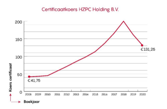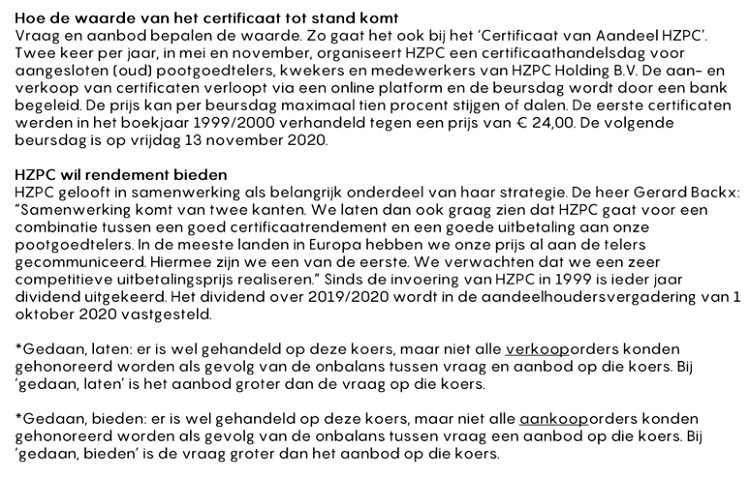 Het aanbod van certificaten is toegenomen. Dit bleek tijdens de halfjaarlijkse beursdag op 8 mei 2020 van aardappelveredelaar HZPC Holding B.V. Op deze dag is de koers van het certificaat van aandeel vastgesteld op € 131,25 (gedaan, laten*). Dit betekent een daling van de waarde van het certificaat HZPC met de maximale 10%. De volgende beursdag vindt plaats op vrijdag 13 november 2020.