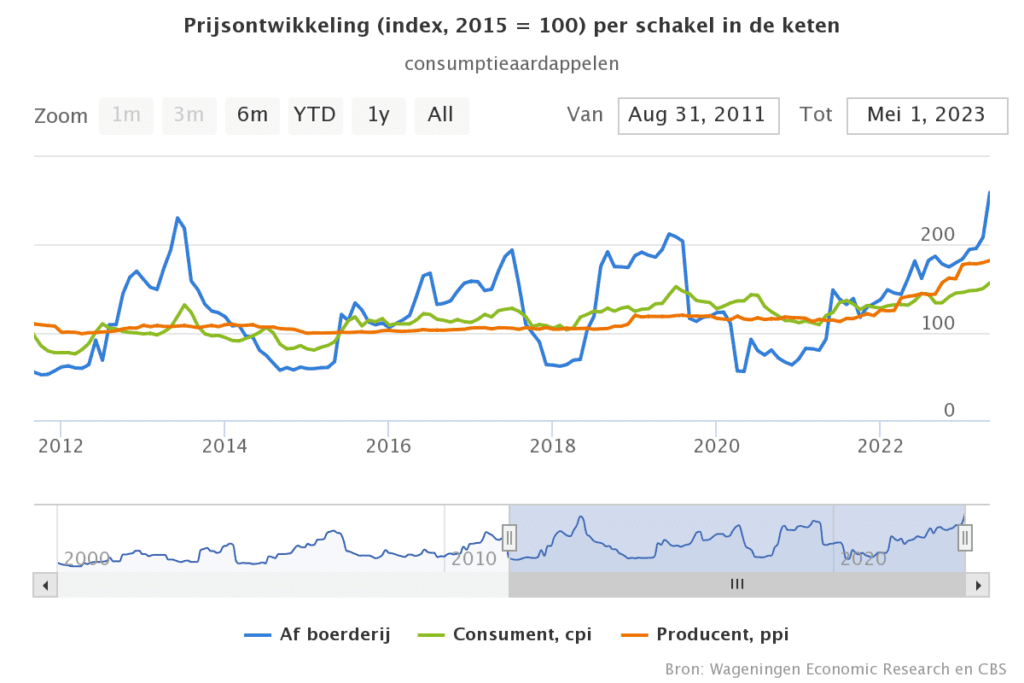 De consumentenprijsindex van aardappelen is in mei 2023 uitgekomen op 157 punten (2015=100). Dat is 6 procent hoger dan de consumentenprijs twee maanden eerder, en 19 procent hoger dan in mei 2022. De gestegen aardappelprijs af boerderij leidt met enige vertraging tot hogere consumentenprijzen.