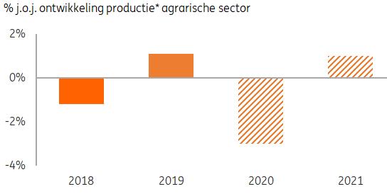 Na de 1% productiegroei in 2019 – overeenkomstig het langjarig gemiddelde – krijgt de agrarische sector in 2020 met krimp te maken, van circa 3%. Voor 2021 verwachten we een inhaaleffect en een terugkeer naar de gemiddelde groei van circa 1%, ondanks externe druk van onder meer teruglopende consumentenbestedingen, internationale handelsconflicten, brexit en stikstofmaatregelen.