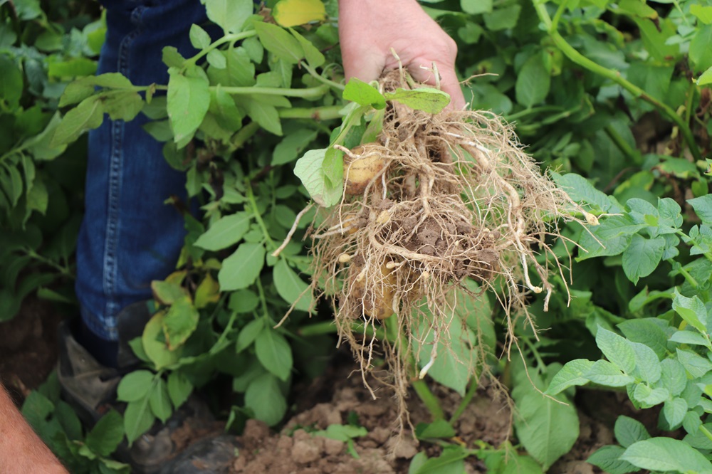 een kort groeiseizoen en een robuust wortelstelsel. “Vooral dat laatste is erg belangrijk gebleken.” In dat kader is ook een aangepaste bemesting van belang. Bij de start van de teelt is calciumopname belangrijker dan de opname van kali en nitraat. Later in het seizoen kun je wel meer kali en nitraat geven. Schriever: “En de calciumgift moet uit vrije calciummoleculen bestaan. Verder is het gebruik van biostimulanten noodzakelijk. Dat zorgt voor een betere balans tussen loofgroei, knolaanzet en wortelgroei.”