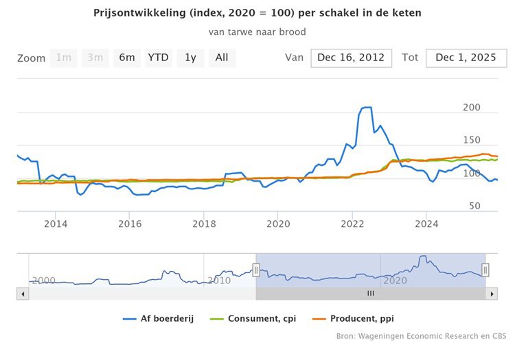 Sinds de recordhoogte van 207 punten in juli 2022 als gevolg van de oorlog tussen Rusland en Oekraïne is de tarweprijs weer gedaald. In november 2025 stond de prijsindex van tarwe af-boerderij op 98 punten. Dit is drie procent hoger dan het prijsniveau in september 2025 en circa 16 procent lager dan in november 2024. Tussen maart 2024 en maart 2025 lag het prijsniveau hoger door tegenvallende graanoogsten als gevolg van een nat voor- en najaar in seizoen 2024-2025 in Europa. Dit jaar had de tarweoogst in (West-)Europa meer te vrezen van de aanhoudende droogte, maar dit lijkt mee te vallen.
