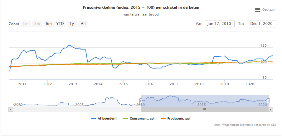 De consumentenprijsindex van brood bleef stabiel en stond in november 2020 op 105 punten (2015=100), even hoog als twee maanden ervoor en een fractie hoger dan in november 2019. De verkoopprijzen van producenten van brood en broodproducten zijn de afgelopen twee maanden vrijwel onveranderd gebleven. Deze prijzen zijn weinig afhankelijk van de actuele ontwikkelingen op de wereldtarwemarkt, omdat de prijsrisico’s en grondstofvoorziening veelal worden afgedekt door contracten. De wereldwijde vraag naar tarwe is toegenomen, waardoor de voorraden iets afnemen.