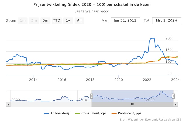De consumentenprijsindex van brood is in maart uitgekomen op 126 punten, net iets hoger dan het prijsniveau in januari dit jaar. Het is in lijn met de prijsniveau van 2023 en nog steeds ruim boven het prijsniveau voor 2022 toen het rond de 110 punten lag. De producentenprijsindex is uitgekomen op 128 punten in maart 2024, één procent hoger dan in januari 2024 en drie procent hoger dan een jaar eerder.