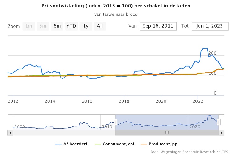 De consumentenprijsindex van brood is in mei 2023 uitgekomen op 133 punten (2015=100), hetzelfde niveau als twee maanden ervoor en 19 procent hoger dan in mei 2022. De prijsindex van tarwe af boerderij daalde verder in mei 2023 en kwam uit op 133 punten, 15 procent lager dan twee maanden eerder en 44 procent lager dan in mei 2022.