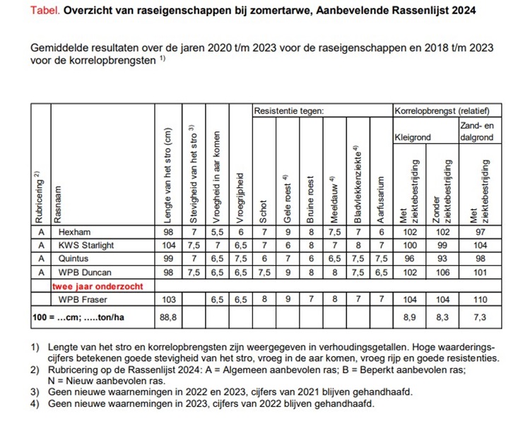 Er worden geen nieuwe rassen van zomertarwe opgenomen in de Aanbevelende Rassenlijst voor 2024. Wel zijn de cijfers en de rubricering van de aanbevolen rassen geactualiseerd in de raseigenschappen.