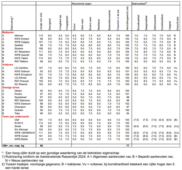 De onderstaande tabel laat het overzicht zien van de eigenschappen van de wintertarwerassen die voor 2024 nieuw zijn opgenomen in de aanbevelende rassenlijst.