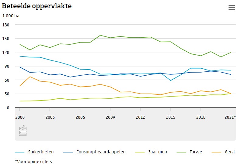 In 2021 is het areaal zaai-uien met 2,9 duizend hectare toegenomen tot 30 duizend hectare, een stijging van 10,5 procent vergeleken met het jaar daarvoor. Het areaal consumptieaardappelen (71,4 duizend hectare) daalde in vergelijking met 2020 voor het tweede jaar op rij met 5,3 duizend hectare, een afname van 6,9 procent. Het areaal suikerbieten (80,7 duizend hectare) nam tegelijkertijd iets af (-0,9 procent).