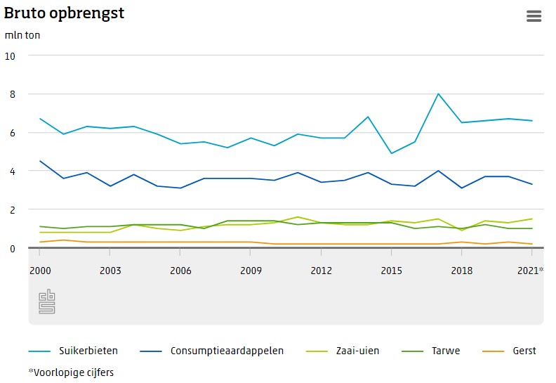In 2021 bedroeg de bruto-opbrengst consumptieaardappelen 3,3 miljoen ton, een daling van 10,7 procent vergeleken met 2020. Er is 6,6 miljoen ton suikerbieten geoogst, ongeveer een procent minder dan een jaar eerder.