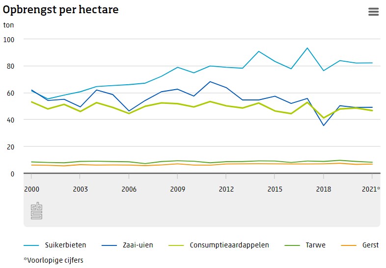 De hectare-opbrengst zaai-uien was in 2021 met 49,1 ton nagenoeg gelijk aan die van een jaar eerder. Een hectare suikerbieten bracht gemiddeld 82,2 ton op. Ook dat is vrijwel gelijk aan de hectare-opbrengst van het jaar daarvoor.